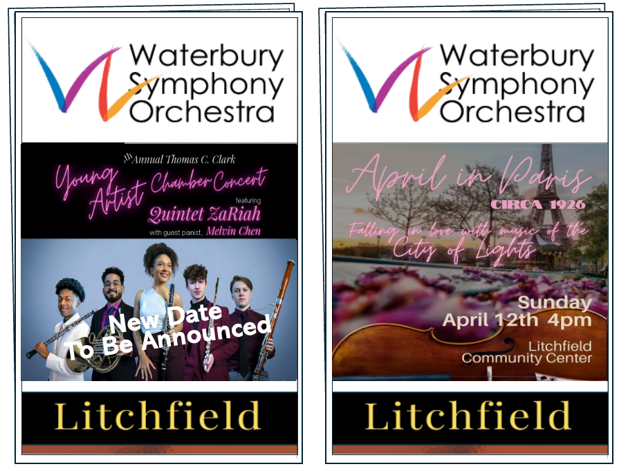 We are sorry to announce that this afternoon’s concert has been POSTPONED due to the winter weather conditions forecasted throughout the day into the night. There is a Winter Weather Advisory for Litchfield and much of Connecticut and out of concern for the safety of our patrons and performers travelling quite some distance to home after the concert we feel this is the right thing to do.